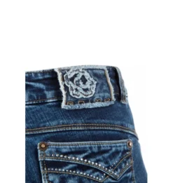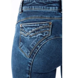 The breeches are made of a breathable and pleasant to the touch material, which fits snugly, but does not restrict the rider’s movements. The breeches have a standard rise and two front pockets. A fake pocket with shiny crystals has been placed on the back for decoration. The breeches are equipped with a short silicone grip, which improves the rider’s adhesion to the saddle. At the bottom of the legs there is elastic ribbing, which prevents the pants from rolling up while riding. One of the legs features a decorative Animo logo.