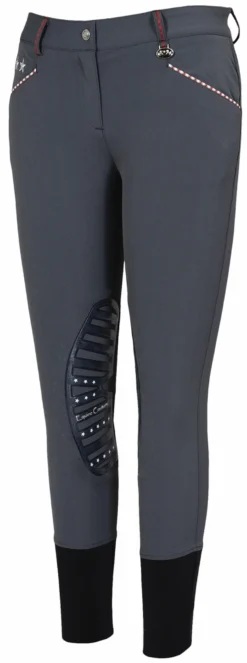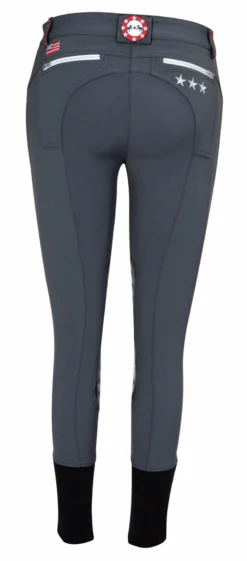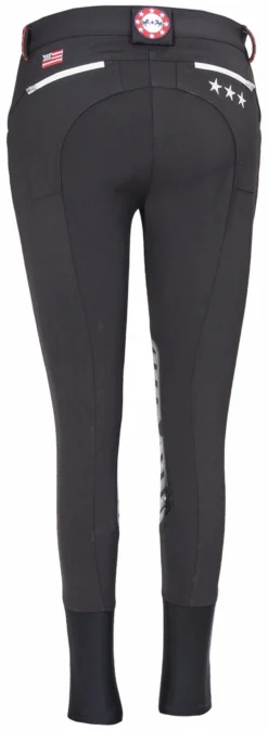 Be on-trend in the Equine Couture Stars & Stripes Knee Patch Riding Breeches. Featuring silicone knee patches, these equestrian pants are sure to make you stand out in a crowd and will fit comfortably while riding. Contrast stitching on the belt loops, star embroidery along the front and back pockets, striped piping along front pockets, and a rhinestone button closure will make these breeches a stylish and unique addition to your riding wardrobe.
