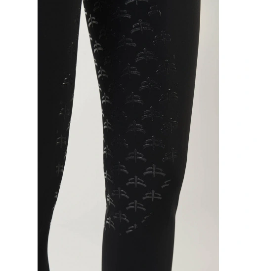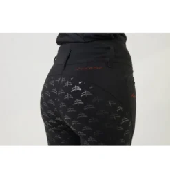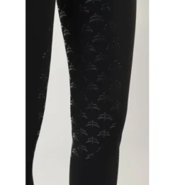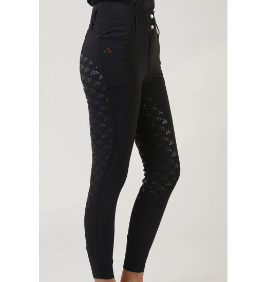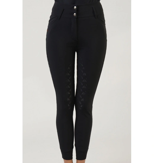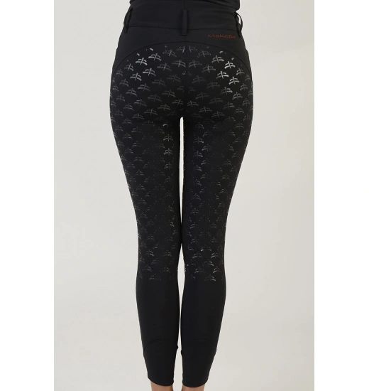 Women’s MaKeBe dressage breeches with a full silicone grip and high waist. The breeches are made of the highest quality elastic, breathable, and comfortable material. There are two classic pockets on the front. The bottom of the legs is trimmed with an elastic jersey, which provides perfect fit. These breeches are decorated with a small logo and MaKeBe writing.