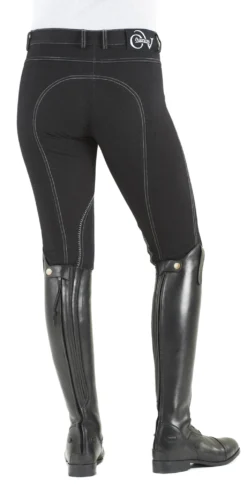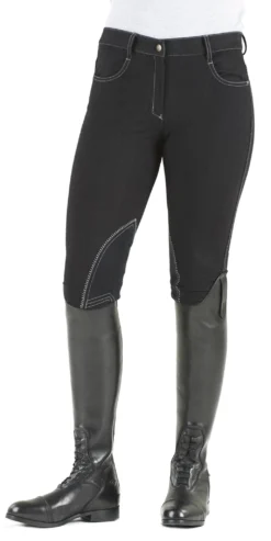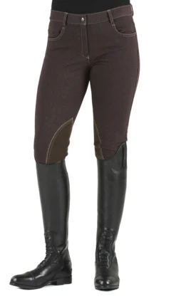 Finally, a breech that is as comfortable as your favorite lounge pants! The mid-weight knit fabric is super soft and stretchy for all day comfort.  PrimaUV™ provides UPF 30 protection against 96% of UVA, and FreshLock™ lends anti-microbial and odor-resistant properties. Front jean styling makes this cute Euro Seat breech perfect for casual riding wear. Features contrast stitching, suede logo patch and knee patches plus stretch ankle opening. Machine wash.