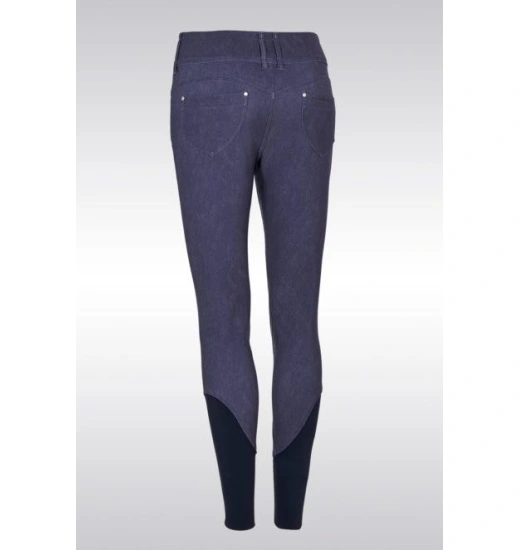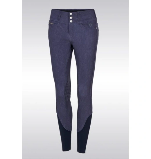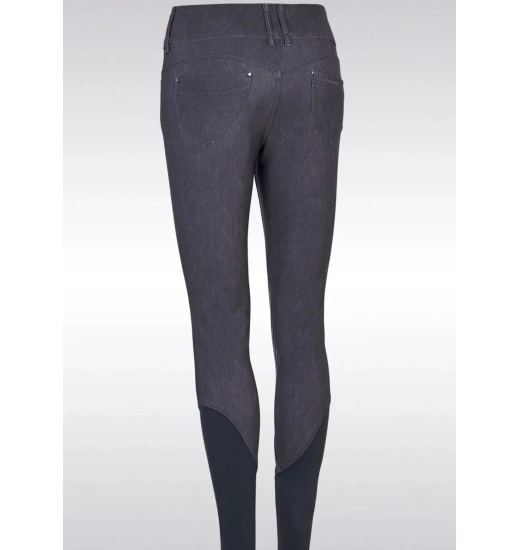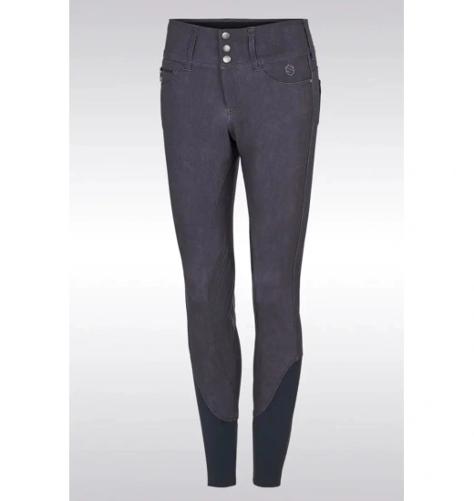 Elegant women’s breeches with a silicone knee grip. The breeches have a high waist and three buttons. They are made of the highest quality elastic fabric. Its breathable material provides perfect drainage of moisture. The given cut of the breeches excellently fits the body, at the same time allowing for full freedom of movements. The silicone grip enhances adhesiveness and stabilization in the saddle. The breeches have five pockets. They are decorated with a shiny Samshield logo.