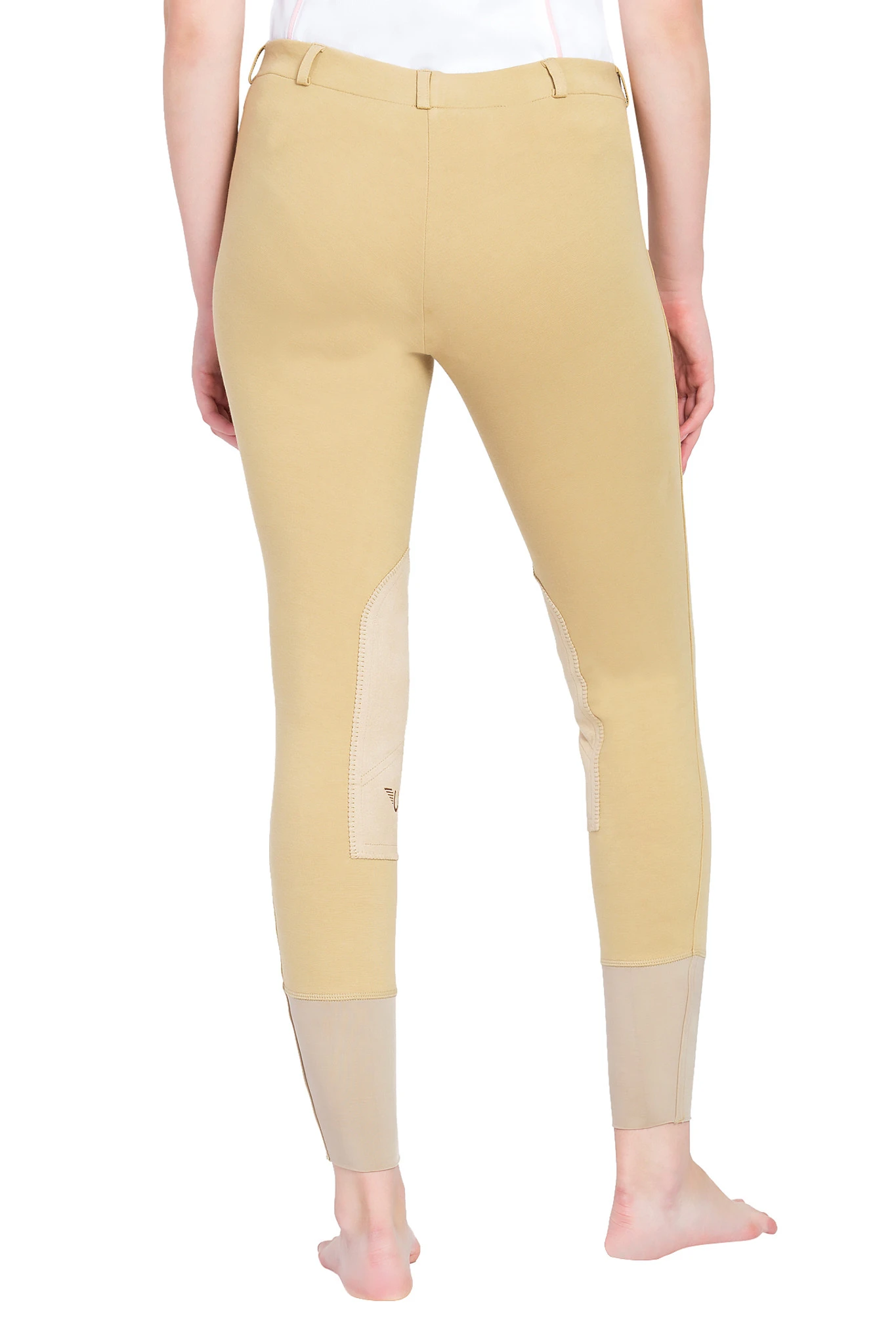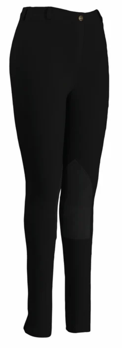 TuffRider Cotton Pull On Breeches are made with comfortable, cotton/Lycra fabric, have a false fly, comfort sock leg openings, and UltraGripp washable, suede, knee patches. Super comfortable, regular rise, breeches for riding every day.