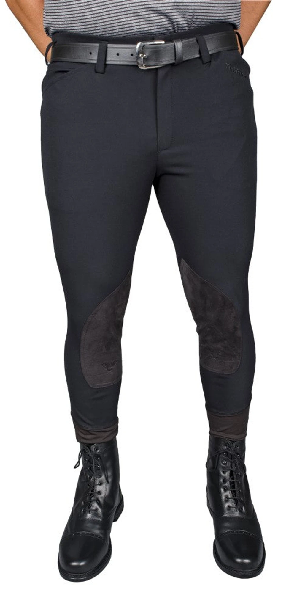 The TuffRider Men’s Claudio Knee Patch Breeches are made from soft and stretchy Nylon and Spandex to keep you comfortable in and out of the saddle. This breech boasts traditional styling with a sueded knee patch and a zipper and hook and eye button closure. Two back pockets with button closure are large enough to store your cell phone safely, while two front pockets help to store your other essentials.