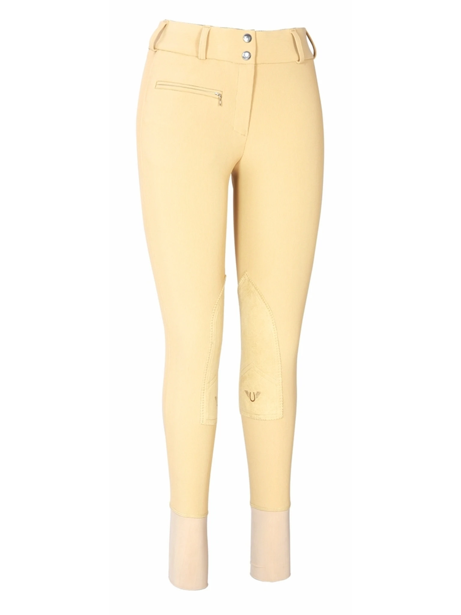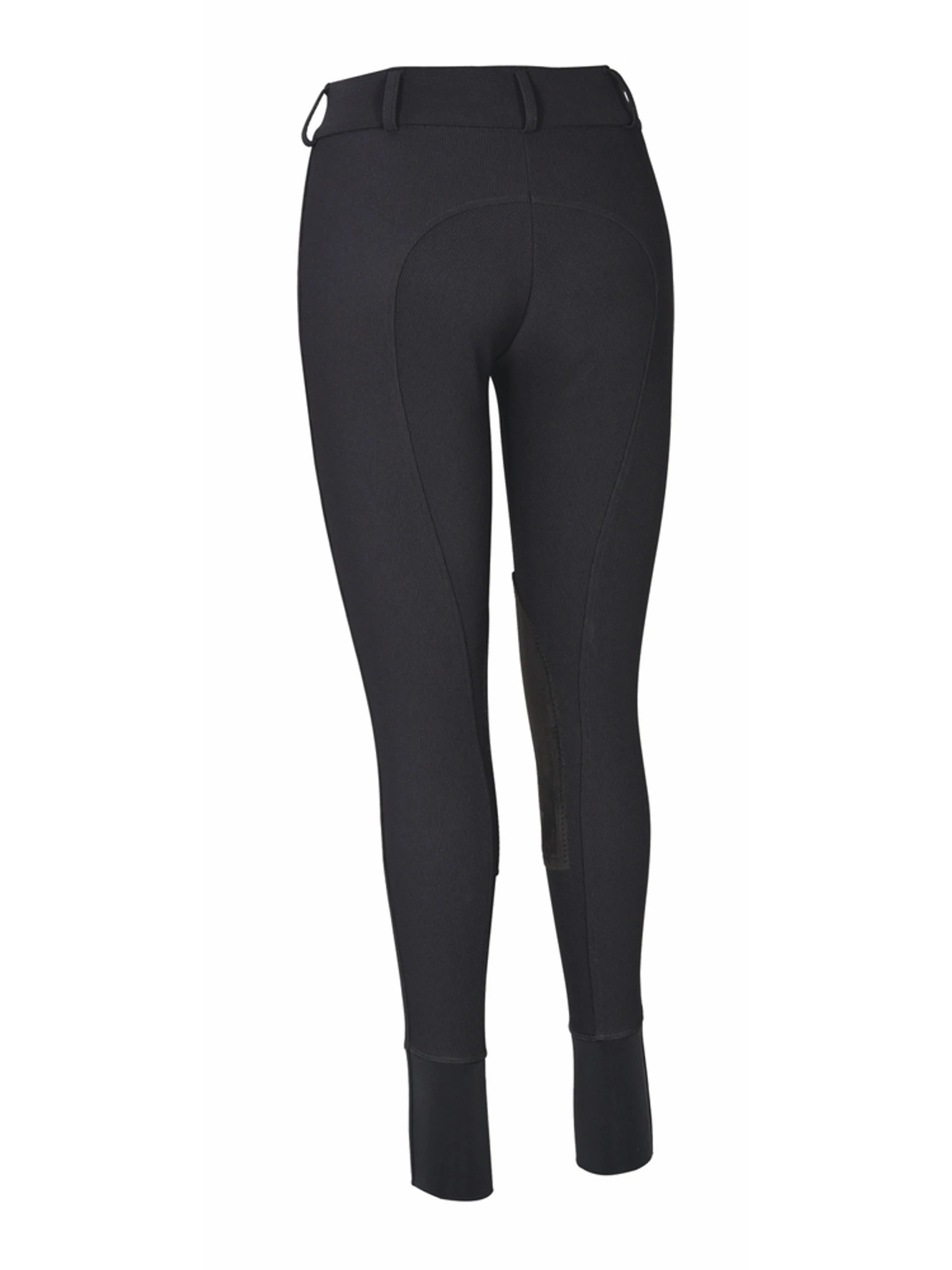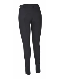 This ladies knee patch riding breech offers a modern look with a low rise, 2″ wide waistband. Other features of this riding pant include durable ribbed fabric, belt loops, and the patented UltraGripp™, Flex-Patch knee patch that prevents bunching while you ride. The front zipper pocket is large enough for treats or a cell phone, with euroseat stitching and contoured sock bottoms to avoid bunching under boots. These breeches are affordable, and will quickly become your favorite breeches too!